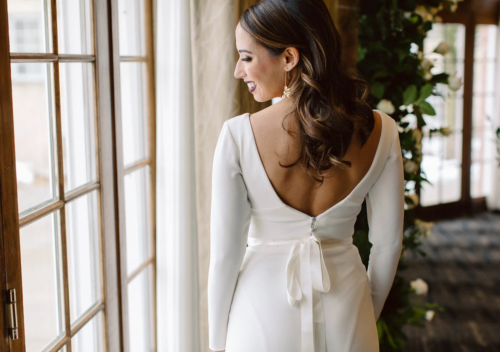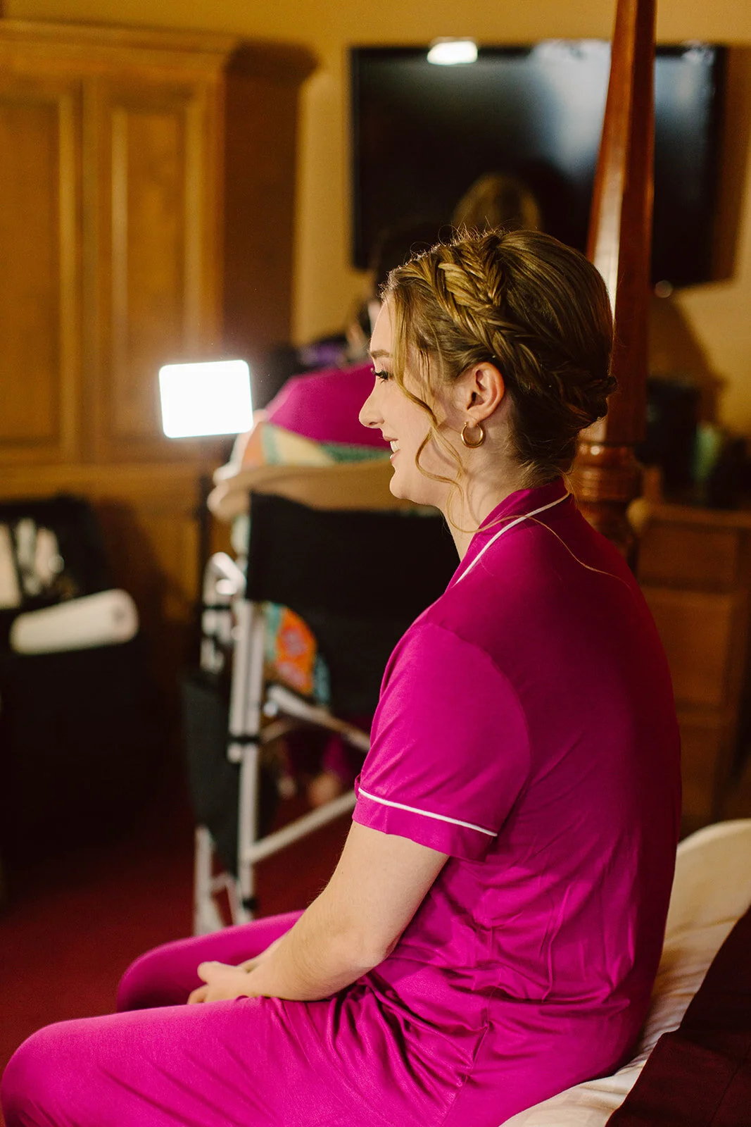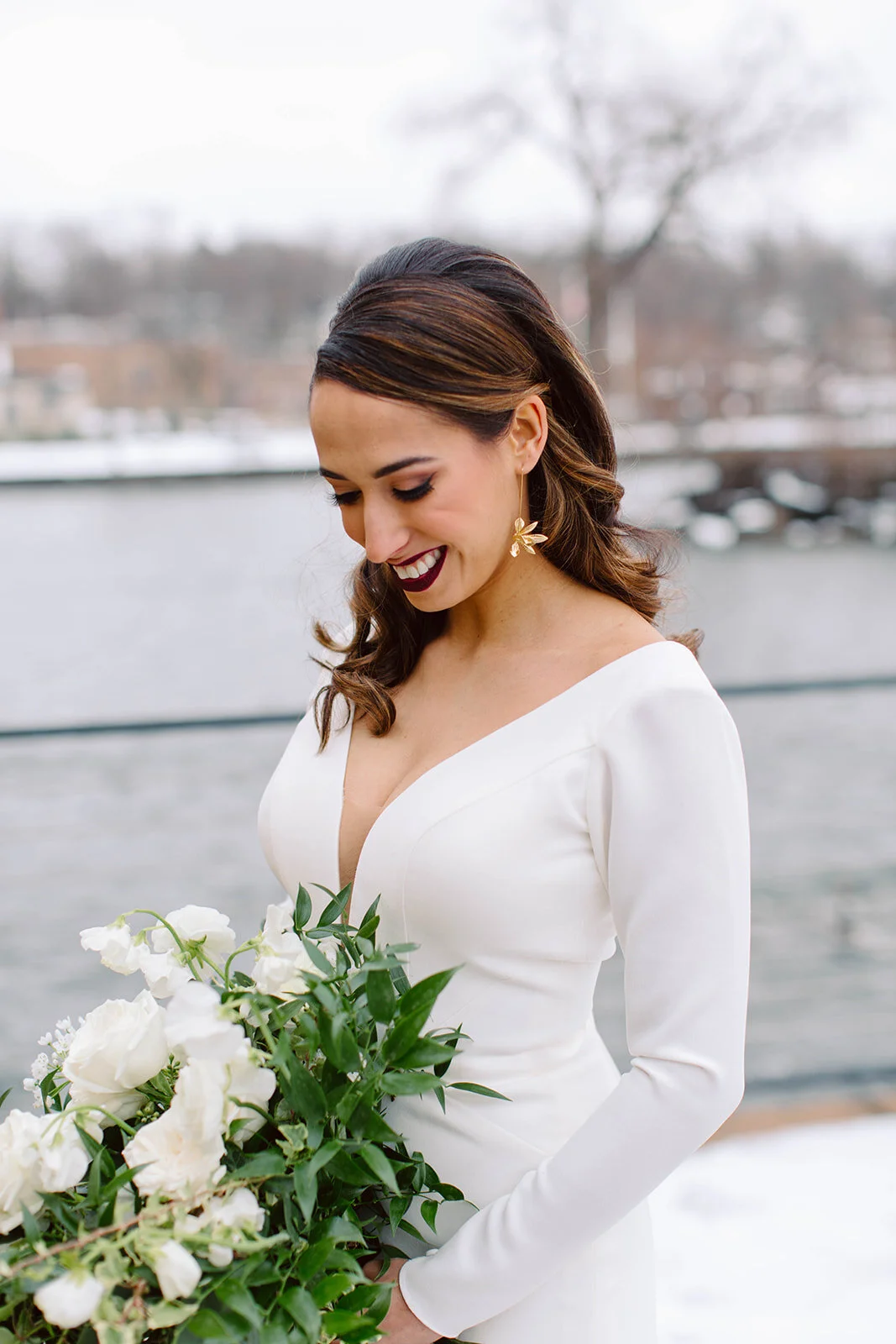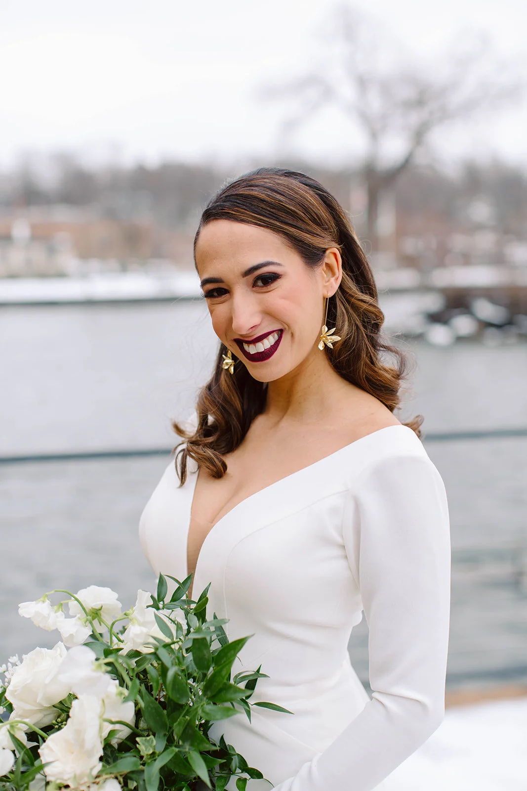 Hayley’s makeup is an extraordinary compliment to her coloring and the season. We used browns, burgundy and nude-pink on the eyes, paired with a crisp wing eyeliner and TBBT’s silk lashes. But the real showstopper here is THAT LIP! Surrounded by all that white, we simply cannot take our eyes off of Hayley’s smile!